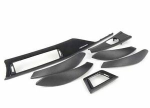 An innovative and unique design taken from the world of Motorsport- this 7-piece interior trim set replaces the vehicles existing trim (door handle pulls, center console trim, and dashboard insert) with open-pore carbon fiber and Alcantara.