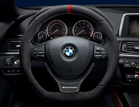 The M Performance steering wheel is fully covered with high-quality Alcantara and flattened at the bottom. The diameter is382 mm, the steering wheel cross-section is 40 x 32 mm. The steering wheel finisher is refined with painted carbon polished to a high gloss and features M Performance lettering in chrome.The steering wheel also has a motorsport central marking in red leather at the 12 o'clock position and also boasts a silver-grey cross-stitch seam.