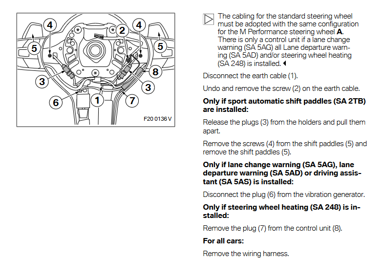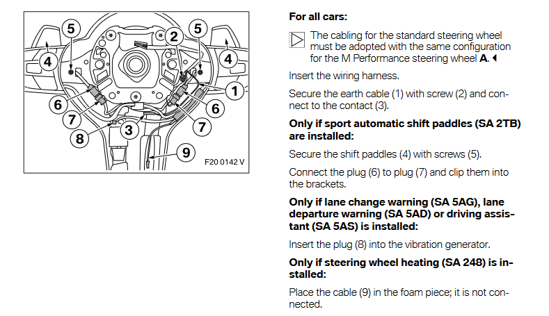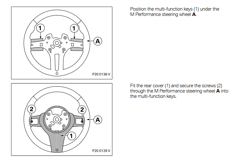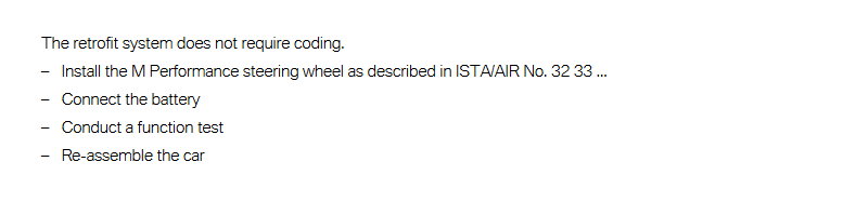 When installing the M Performance steering wheel in cars with steering wheel heating SA 248, the heating function will no longer work. It does not need to be decoded. The switch for steering wheel heating remains non-functional. The error memory message can be ignored.