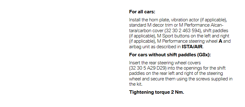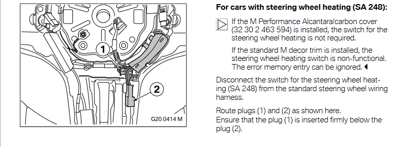 When installing the M Performance steering wheel in cars with steering wheel heating SA 248, the heating function will no longer work. It does not need to be decoded. The switch for steering wheel heating remains non-functional. The error memory message can be ignored.