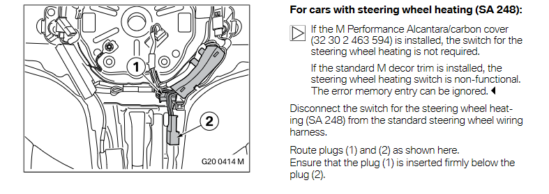When installing the M Performance steering wheel in cars with steering wheel heating SA 248, the heating function will no longer work. It does not need to be decoded. The switch for steering wheel heating remains non-functional. The error memory message can be ignored.
