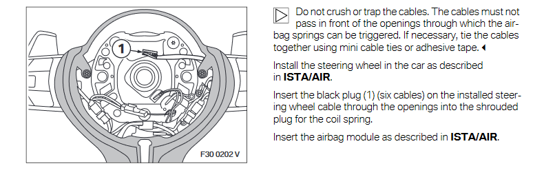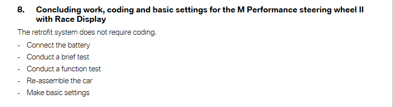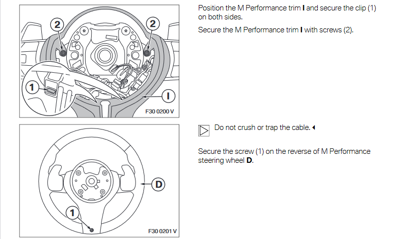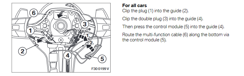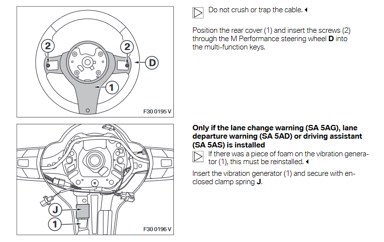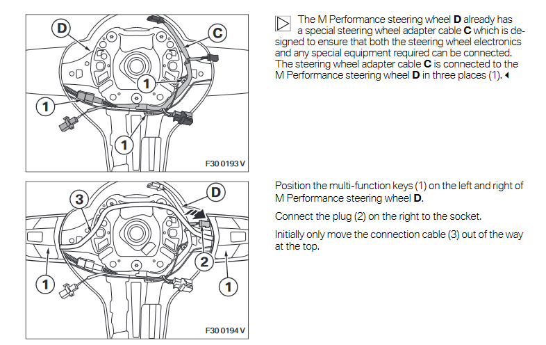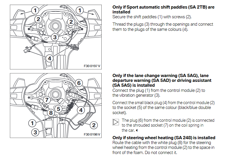 M Sport leather steering wheel (SA 710) - built after 07/2013: All parts can be adopted. Basic steering wheel, leather steering wheel (SA 240), Sport steering wheel (SA 255) for all cars plus the M leather steering wheel for cars before LCI - built up to 07/2013. When installed with SA 248 (heated steering wheel), the heating function is disabled; it does not need to be decoded. The switch for the heated steering wheel remains without function.