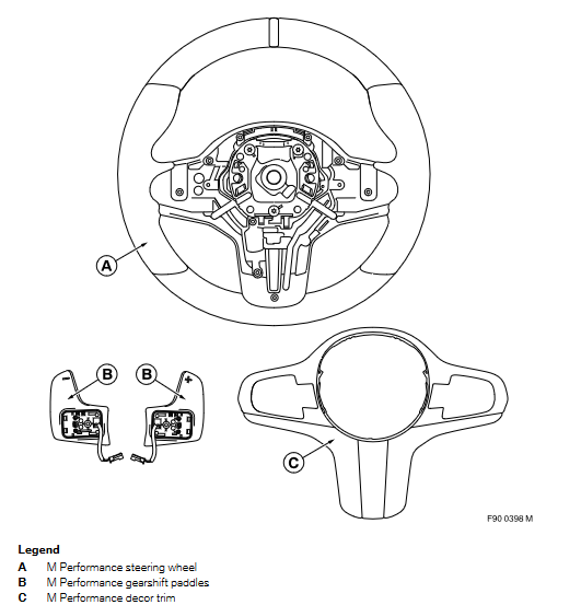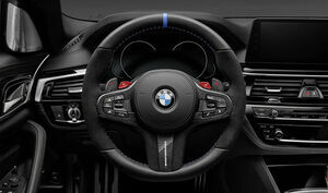 The steering wheel trim is made of carbon/ PUR polished to a high gloss and Alcantara and has an M Performance logo in the bottom clasp.