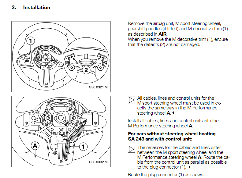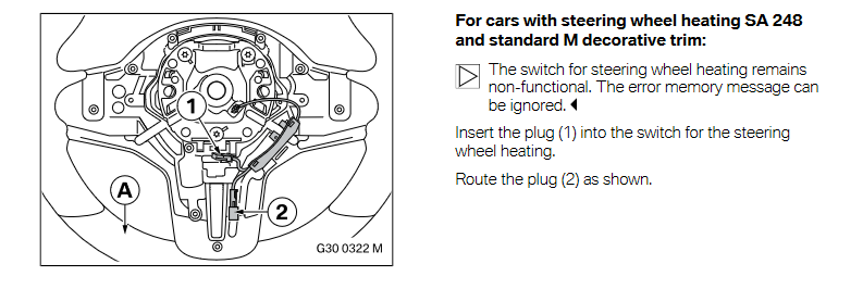 When installing the M Performance steering wheel in cars with steering wheel heating SA 248, the heating function will no longer work. It does not need to be decoded. The switch for steering wheel heating remains non-functional. The error memory message can be ignored.