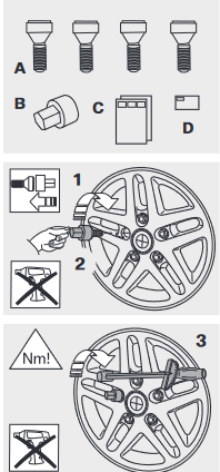 Fitting the wheel bolt lock: Before installing the wheel bolt locks, please check that the thread and stem/total length of the original bolts and those of the wheel bolt lock are the same.